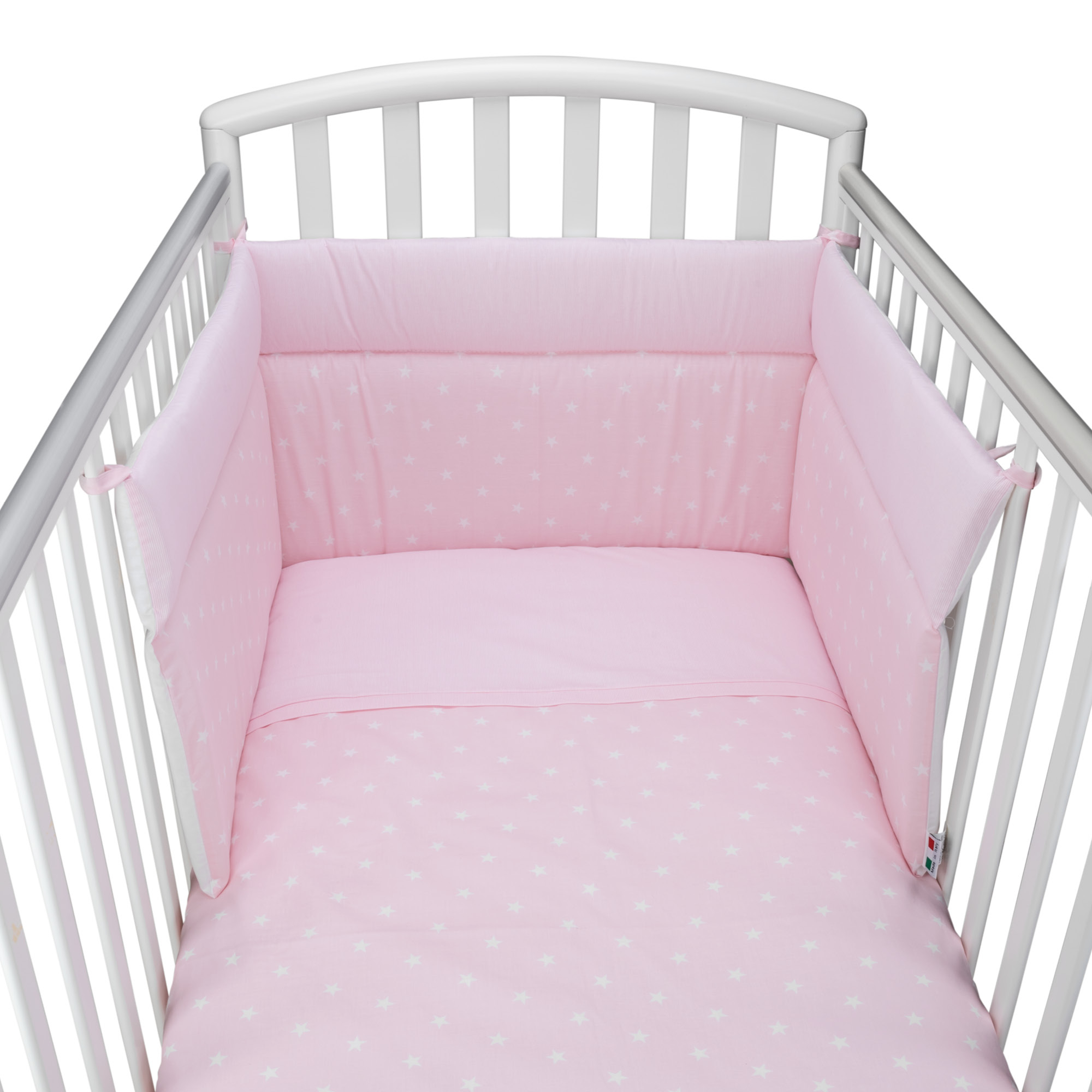 Il completo piumone lettino Stella Rosa è realizzato con tessuto stampato 100% cotone. Il paracolpi della linea Stella è lineare: Baby Idea® ha studiato e realizzato la versione lineare perchè ancora maggiormente adattabile a tutti quei lettini che offrono la possibilità di modificare l'altezza della posizione del materasso. In questo modo il neonato è sempre ben visibile alla mamma! Una vera esplosione di colore e fantasia per una cameretta calda ed accogliente! Tutti i materiali utilizzati sono prodotti in Italia ed il confezionamento avviene interamente presso il nostro laboratorio artigianale. I tessuti sono in possesso della certificazione Oeko-Tex che garantisce l'assenza di prodotti nocivi e ne attesta, attraverso scrupolose ricerche, assoluta sicurezza e rispetto della salute. Il risultato è un prodotto anallergico, antibatterico e totalmente Made in Italy. Il piumone per lettino è composto da imbottitura in fibra di poliestere anallergica termolegante e traspirante da 450gr rivestita con tessuto in cotone 100%. Il Paracolpi è imbottito in poliestere da 400gr, rivestito con tessuto in cotone 100%. Le imbottiture in poliestere sono anallergiche e traspiranti e realizzate in aziende italiane certificate. Il completo lettino Stella Rosa è realizzato con amore ed è completamente Made in Italy. Ottimo come idea reagalo!