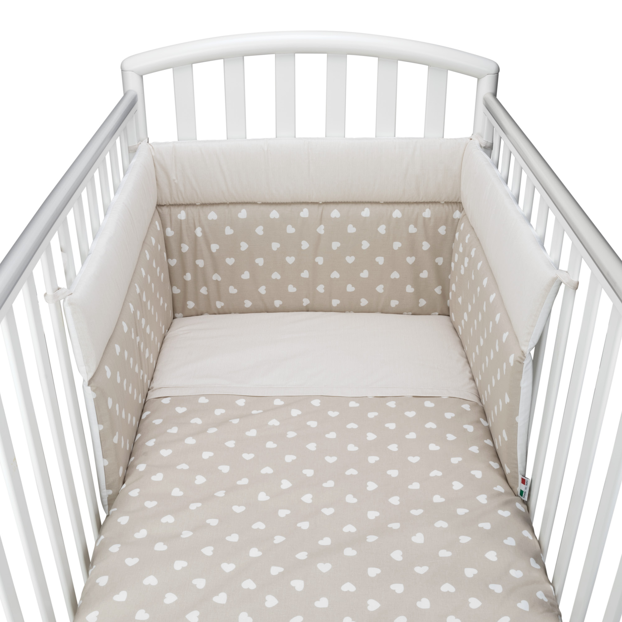 Il completo piumone lettino Cuore Beige è realizzato con tessuto stampato 100% cotone. Il paracolpi della linea Cuore è lineare: Baby Idea® ha studiato e realizzato la versione lineare perchè ancora maggiormente adattabile a tutti quei lettini che offrono la possibilità di modificare l'altezza della posizione del materasso. In questo modo il neonato è sempre ben visibile alla mamma! Una vera esplosione di colore e fantasia per una cameretta calda ed accogliente! Tutti i materiali utilizzati sono prodotti in Italia ed il confezionamento avviene interamente presso il nostro laboratorio artigianale. I tessuti sono in possesso della certificazione Oeko-Tex che garantisce l'assenza di prodotti nocivi e ne attesta, attraverso scrupolose ricerche, assoluta sicurezza e rispetto della salute. Il risultato è un prodotto anallergico, antibatterico e totalmente Made in Italy. Il piumone per lettino è composto da imbottitura in fibra di poliestere anallergica termolegante e traspirante da 450gr rivestita con tessuto in cotone 100%. Il Paracolpi è imbottito in poliestere da 400gr, rivestito con tessuto in cotone 100%. Le imbottiture in poliestere sono anallergiche e traspiranti e realizzate in aziende italiane certificate. Il completo lettino Cuore Beige è realizzato con amore ed è completamente Made in Italy. Ottimo come idea reagalo!