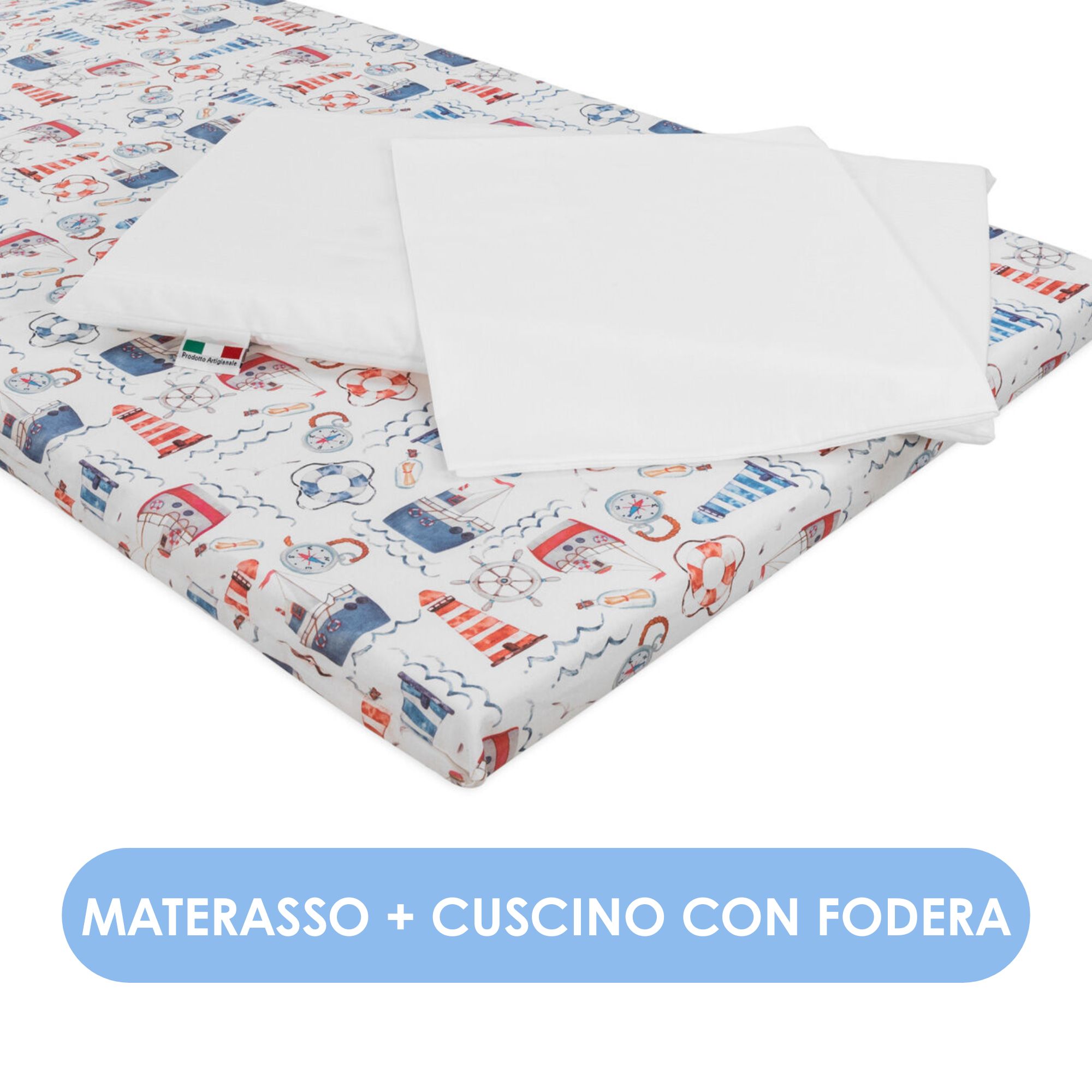 Dimensioni: Materassino Lettino 60x120 con Spessore di 4 Cm. Cuscino con Fori Trasiranti: 52x33x4 cm