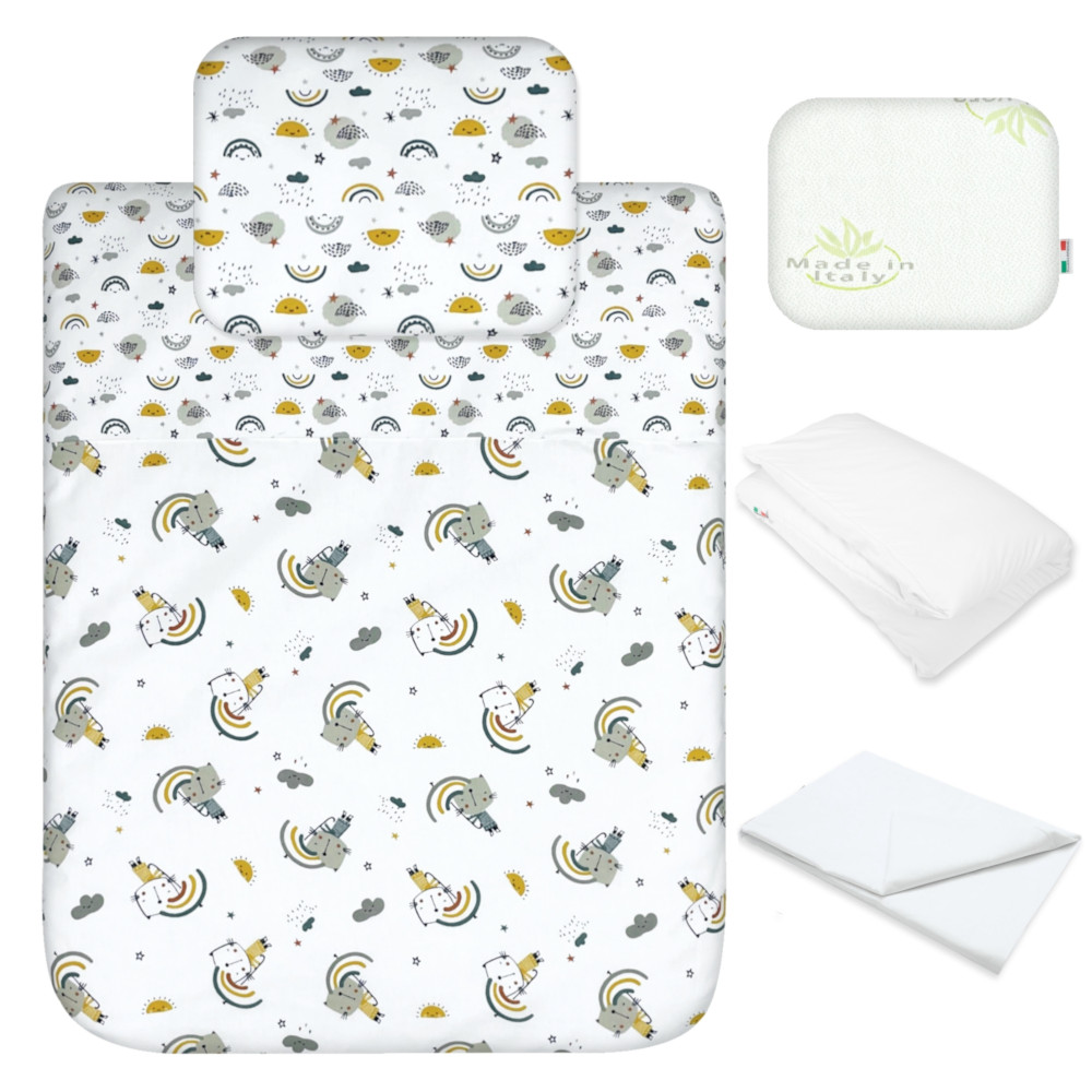 5 Pezzi: il Completo per Culla Neonato Fianco Letto ha in Dotazione: 1 Cuscino Culla con Fori Traspiranti, 1 Federa Cuscino, 1 Lenzulo Sotto con Angoli, 1 Copripiumino A Sacco, 1 Imbottitura Piumino Culla