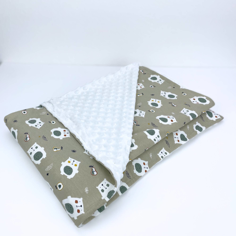 • Morbide coperte double face da lettino, un lato in soffice ciniglia tinta unita e l'altro in jersey 100% in fantasia.
