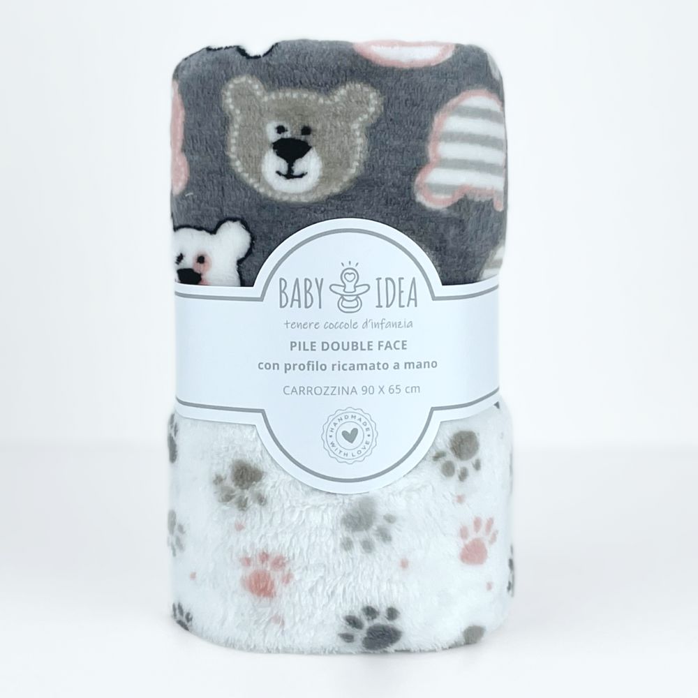 Soffice coperta in pile per culla e carrozzina neonato, utilizzabile anche quando il bambino è in braccio, grazie alle sue dimensioni ridotte rispetto alle coperte standard.