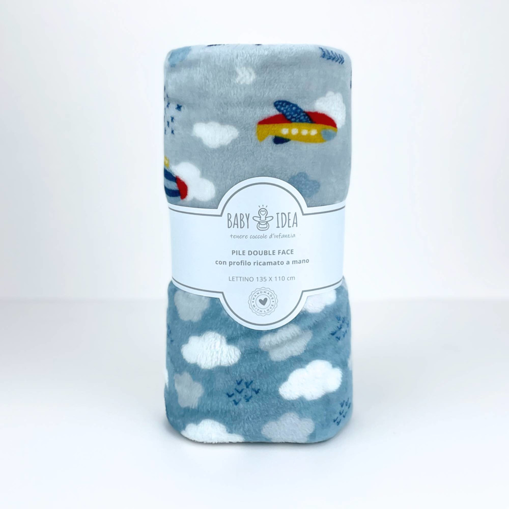 Soffice coperta in pile per lettino bambino. Le coperte sono realizzate in pile, un materiale morbido e caldo, offre un comfort ottimale al bambino. Il bordo è stato rifinito con una cucitura decorativa, il punto cavallo, costituisce il ricamo della tradizione italiana, la decorazione applicata dona un effetto elegante e raffinato. Double face, fantasie diverse in entrambi i lati. Lavabile: in lavatrice a 30° Dimensione: 110x135 cm Produzione e lavorazione 100% Made in Italy nel nostro laboratorio artiginale BabyIdea. Sono disponibili in diverse fantasie.