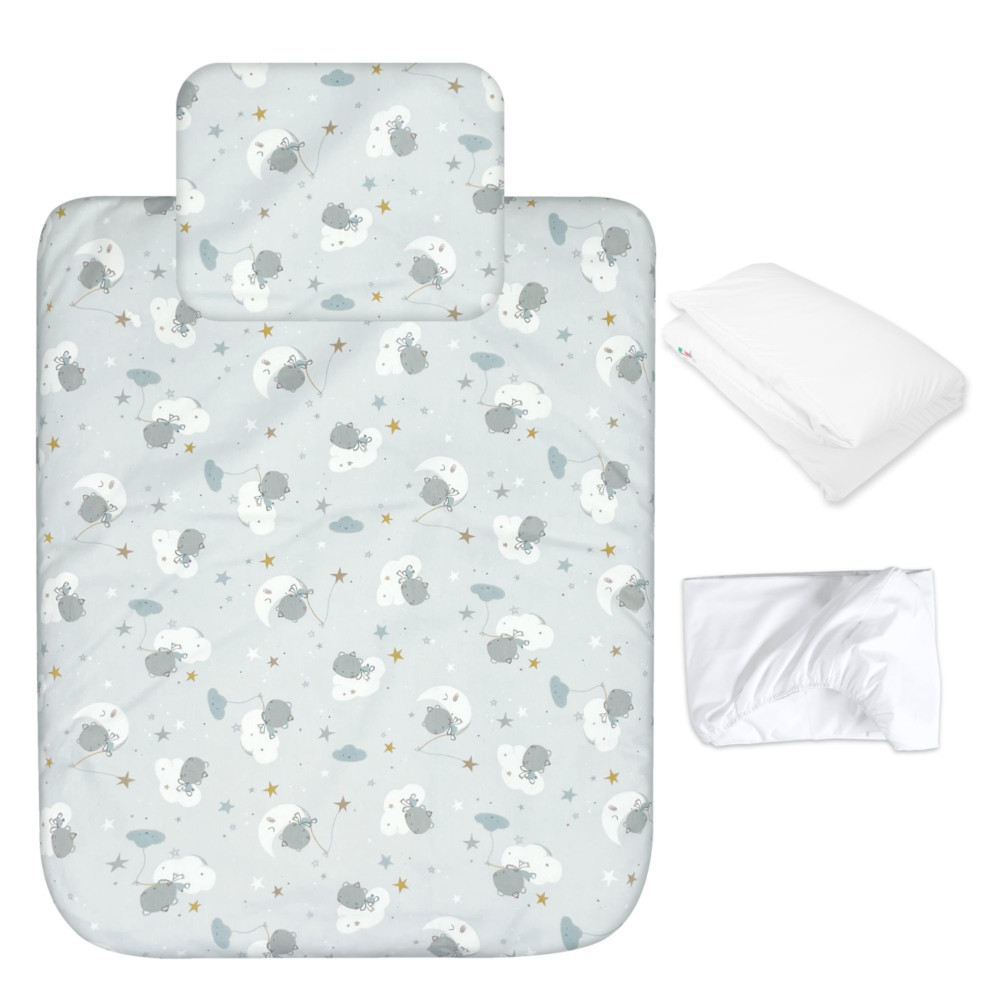 Il set comprende 4 pezzi -Lenzuolo sotto + federa + copri piumino e piumino