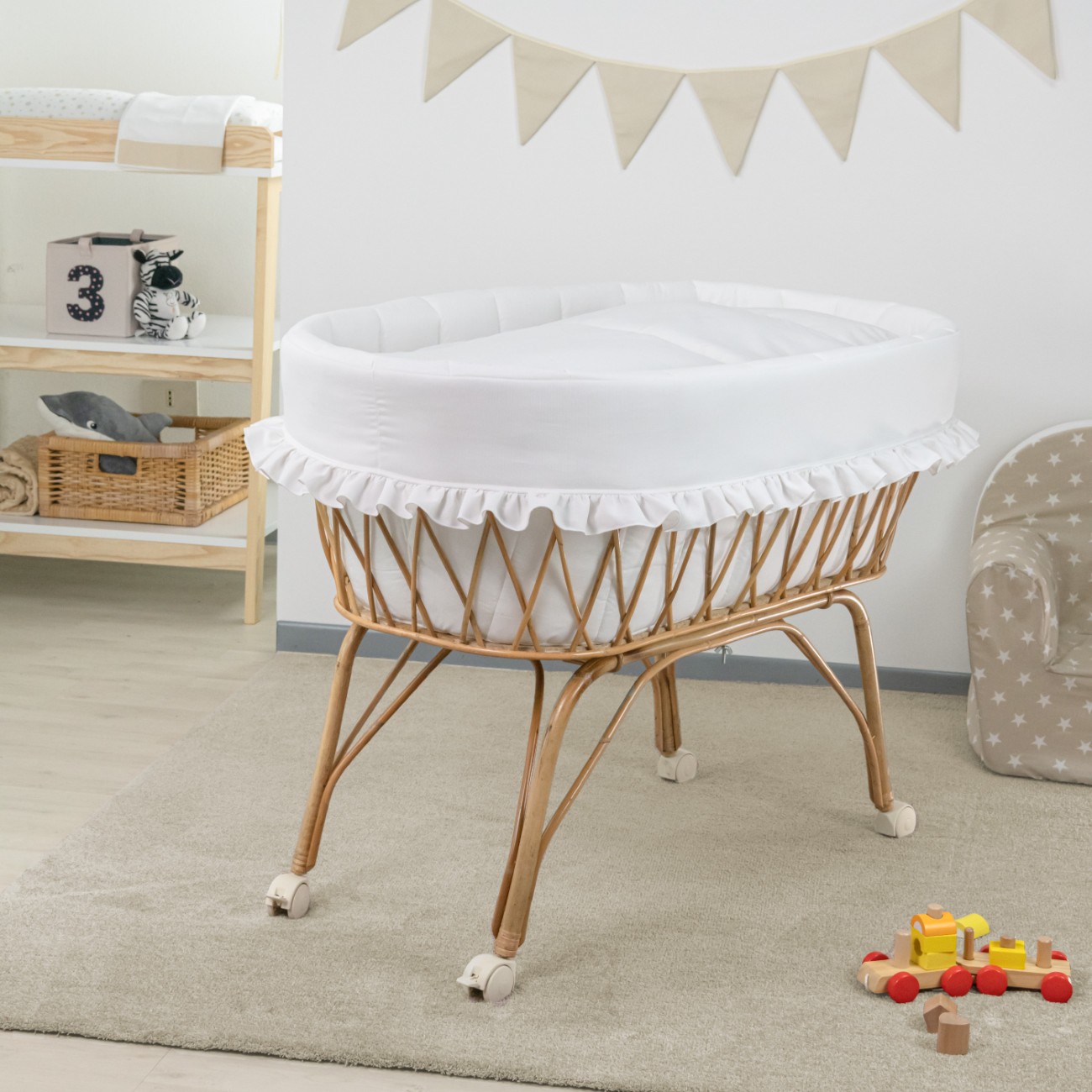 Il carrello in vimini intrecciato a mano è leggero ma stabile, dotato di ruote piroettanti per facilitare gli spostamenti in ogni ambiente della casa. Il rivestimento in cotone 100% con morbida imbottitura interna garantisce un ambiente sicuro e accogliente, mentre il design senza capottina offre massima praticità e un look pulito e moderno, perfetto per ogni stile di cameretta.