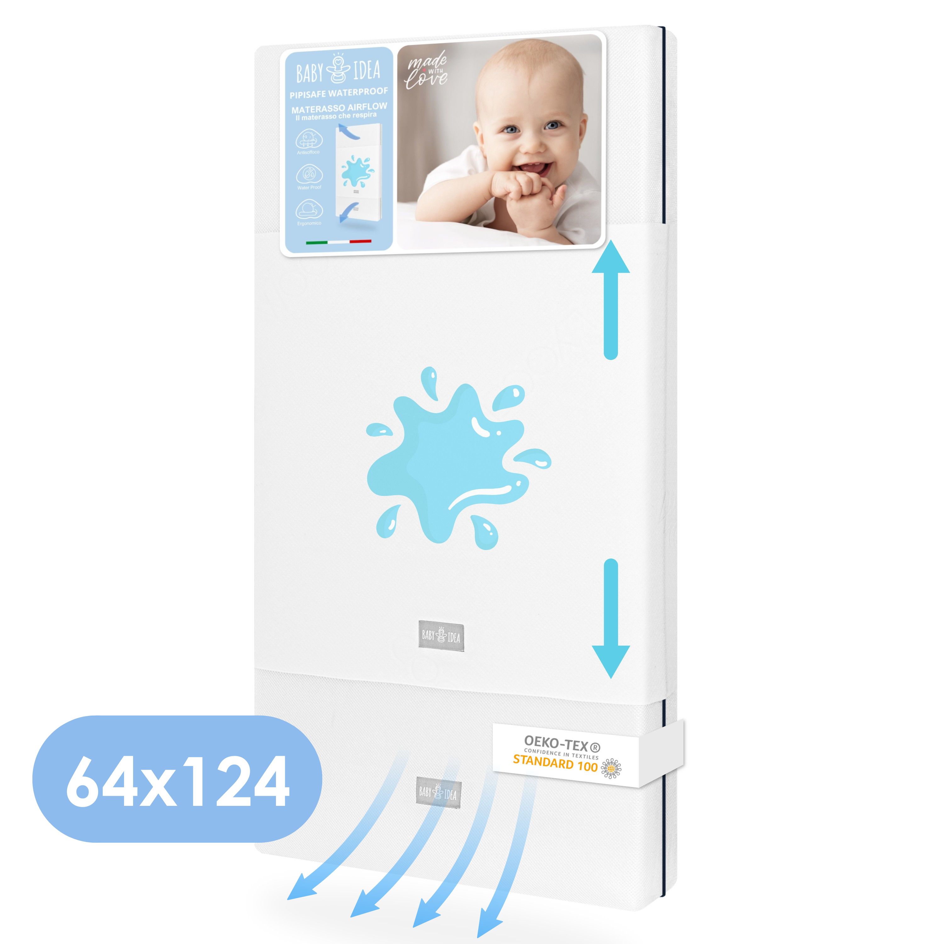 Tutti i materiali e il confezionamento sono Made in Italy, certificati Oeko-Tex®, sicuri, anallergici e antibatterici, a Norma EN16890:2017 per offrire al tuo bambino il massimo comfort.